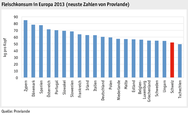 Bezogen auf Europa zeigt sich gemäss Agrarmarkt Informations-Gesellschaft Deutschland (AMI) und Berechnungen von Proviande für das Jahr 2013, dass die Schweiz beim Pro-Kopf-Konsum mit 52,0 kg/Jahr auf dem zweitletzten Platz vor Tschechien (49,5 kg/Jahr) liegt. Die Spitzenplätze belegen in Europa Zypern (85,0 kg/Jahr), Dänemark (78,3 kg/Jahr) und Spanien (77,6 kg/Jahr).
