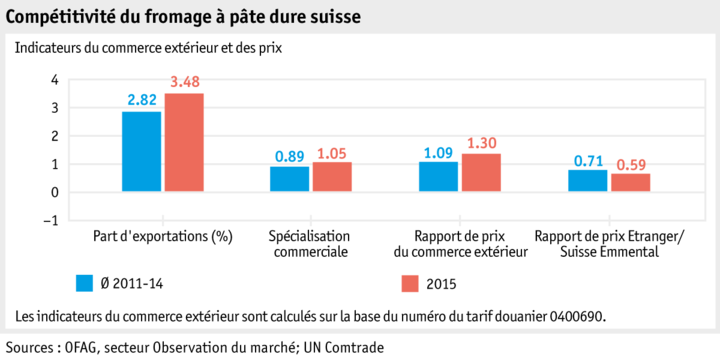 La Suisse affiche une plus grande spécialisation commerciale que ses voisins. Dans le commerce international, elle est davantage spécialisée dans le fromage à pâte dure que la plupart des autres pays (à l’exception de la France). À l’inverse, la spécialisation commerciale de l’Allemagne est négative en dépit d’un pourcentage d’exportations relativement élevé (12,9 %), parce qu’elle importe aussi beaucoup de fromages à pâte dure. La faible valeur de l’indicateur du rapport de prix étranger/Suisse indique une situation concurrentielle défavorable pour le fromage à pâte dure suisse.