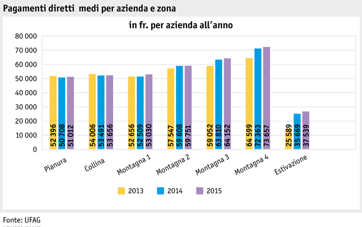 Se si considerano i pagamenti diretti erogati mediamente per azienda (cfr. grafico seguente), si constata che sono più cospicui nelle aziende ad alta quota. Da un'analisi dell’evoluzione dei pagamenti diretti si rileva che negli ultimi 3 anni quelli versati nelle zone collinare e di montagna I sono rimasti praticamente stabili. Nel 2015, le aziende delle zone di montagna II-IV, e in particolare quelle d'estivazione hanno ricevuto mediamente più pagamenti diretti rispetto al 2013. Le aziende di pianura hanno percepito meno pagamenti diretti rispetto a quelli di cui beneficiavano prima del cambio del sistema. Si noti che si tratta di valori medi e che i valori delle singole aziende possono discostarsi notevolmente.